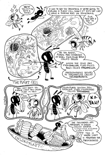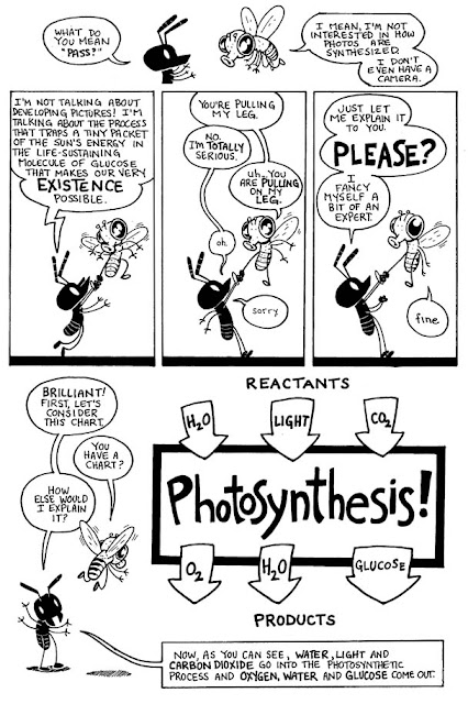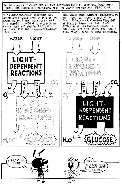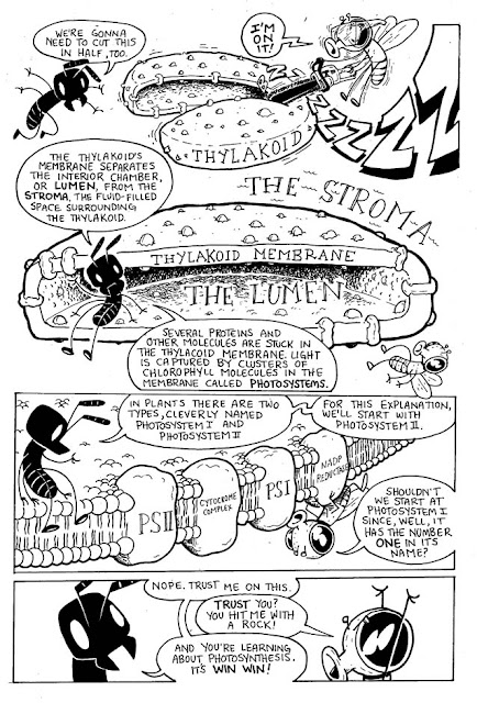 Jay Hosler macht drüben bei „Drawing Flies“ herzallerliebste Cartoons zu wissenschaftlichen Themen und wünscht sich zu seiner neuesten Serie „Photosynthesis“ ein wenig Input. Ich finde den Ansatz toll, weil er so schön grafisch ist, wenn auch zwangsläufig vereinfacht. Momentan endet die Geschichte beim Elektronenübergang zum membrangängigen Plastochinon, die Elektronentransportkette beginnt also erst und die Generation von ATP aus dem Protonengradienten steht noch aus.