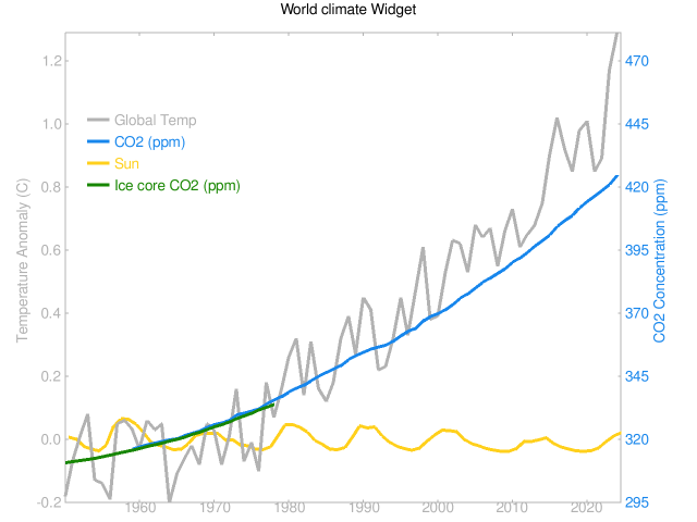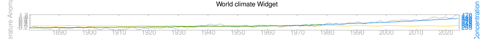 [Antwort: Super, danke, siehe Update oben. Noch ein Vorschlag: das Widget sieht nicht so gut aus, wenn man es klein darstellt (z.B. 300×200 pixel) – dazu müsste man an der Beschriftung noch etwas justieren. Ich würde auch die CO2-Kurve über die Temperaturkurve legen, sonst verschwindet sie bei kleiner Darstellung fast hinter der Temperatur, wegen deren vielen Zacken. Und vielleicht können Sie noch ein Stück Beispiel-html-code zum Reinkopieren in die eigene Website auf Ihre Seite stellen, um es Nutzern noch einfacher zu machen, das Widget einzubinden? Stefan Rahmstorf]